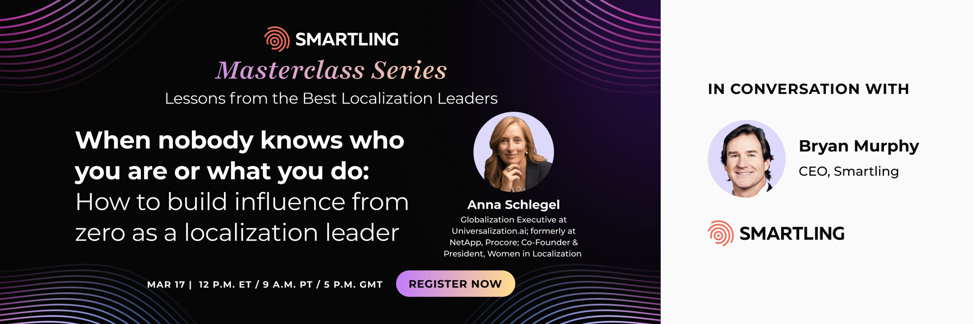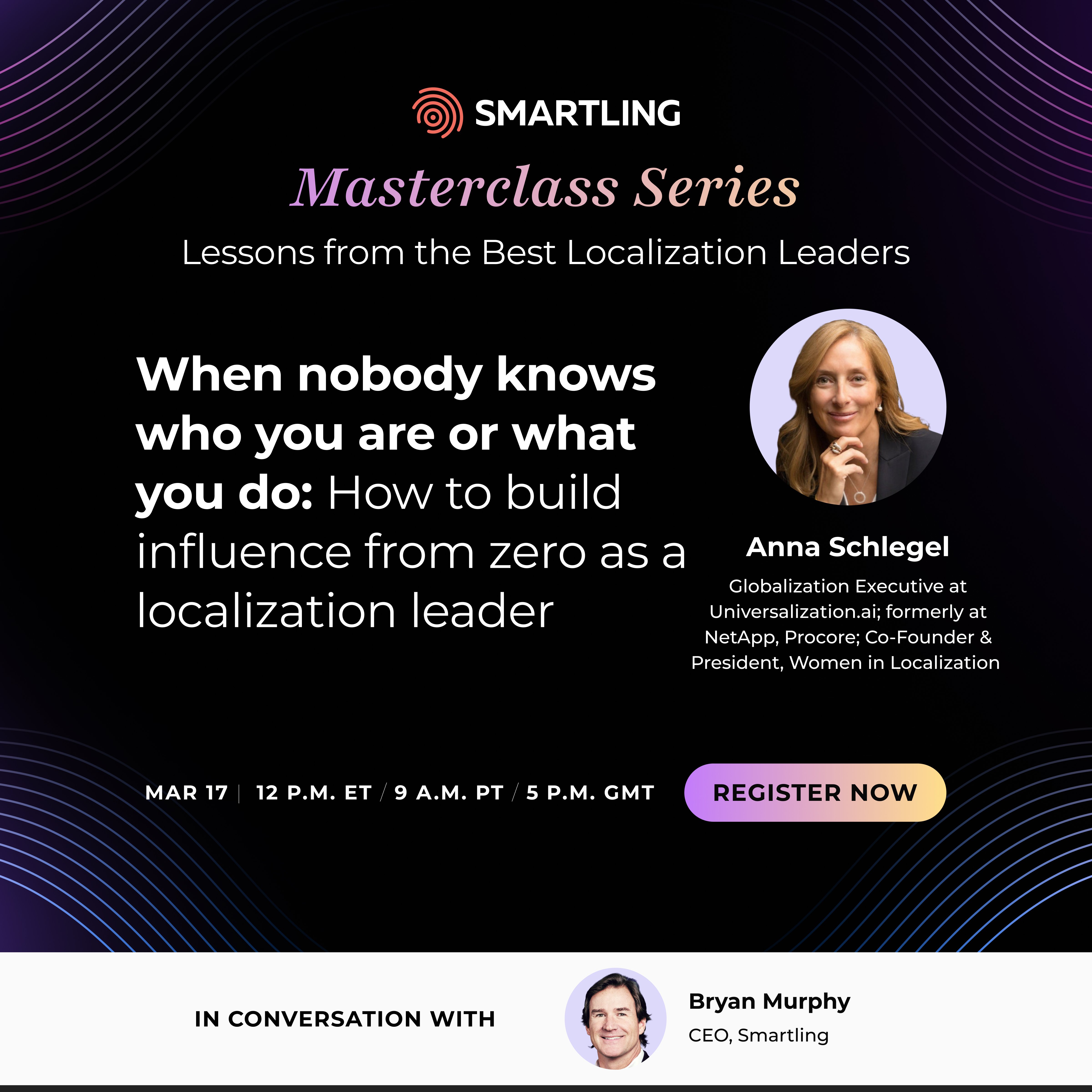 In this episode of the Masterclass Series: Lessons from the Best Localization Leaders, Smartling CEO Bryan Murphy sits down with Anna Schlegel, Globalization Executive at Universalization.ai, former leader at NetApp and Procore, and Co-Founder and President of Women in Localization. Whether you lead localization or partner with a loc team to drive international growth, Anna's hard-earned lessons are ones you can put to work immediately.